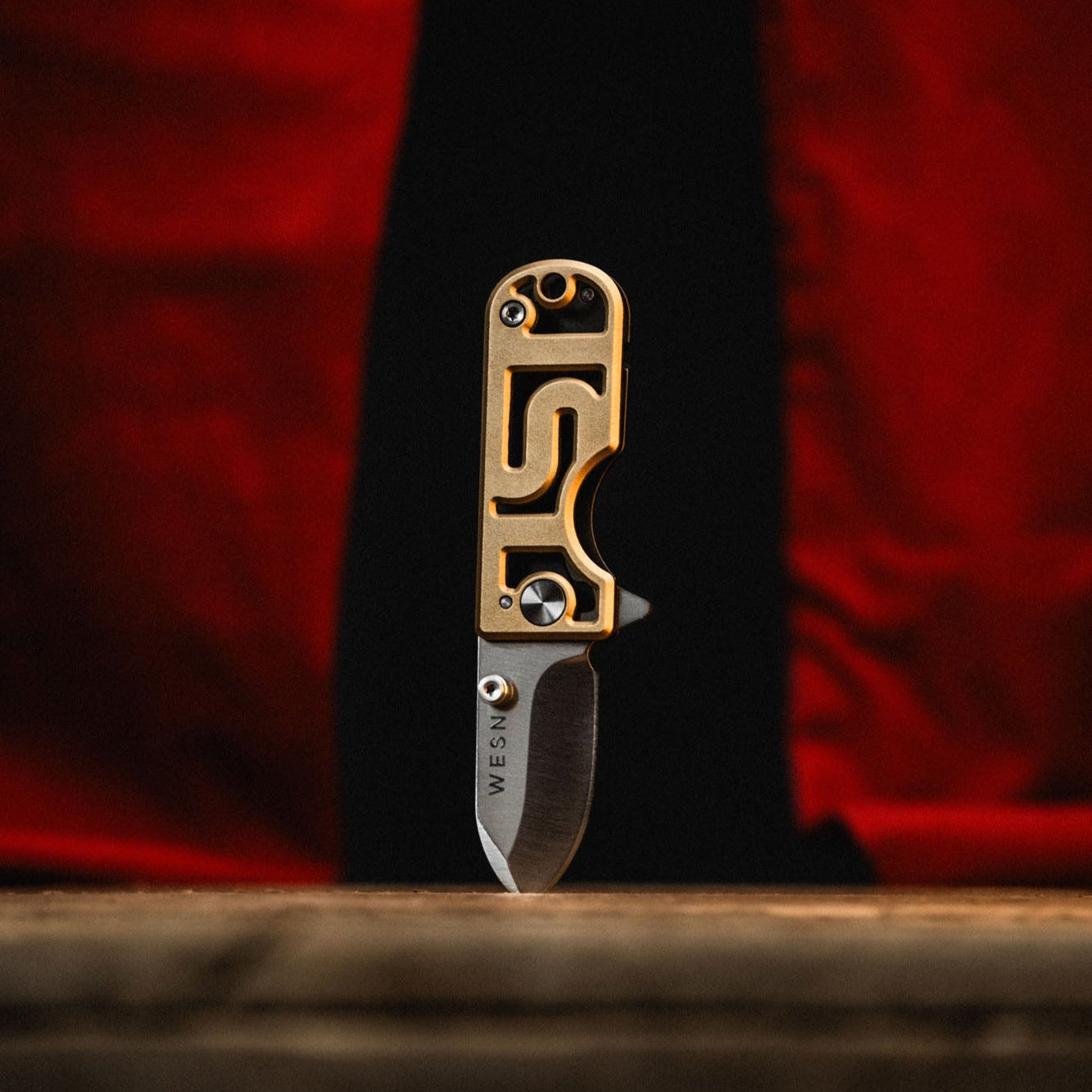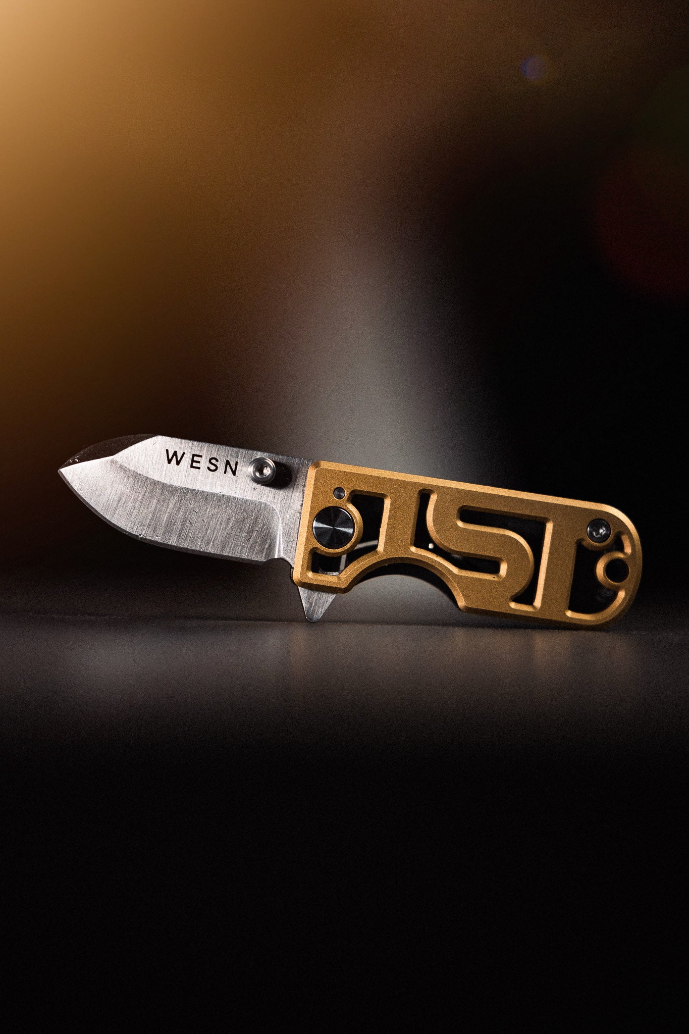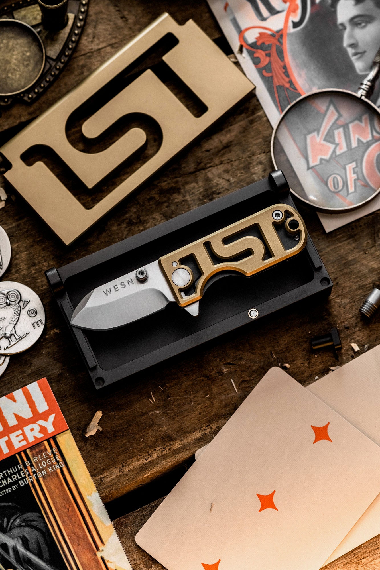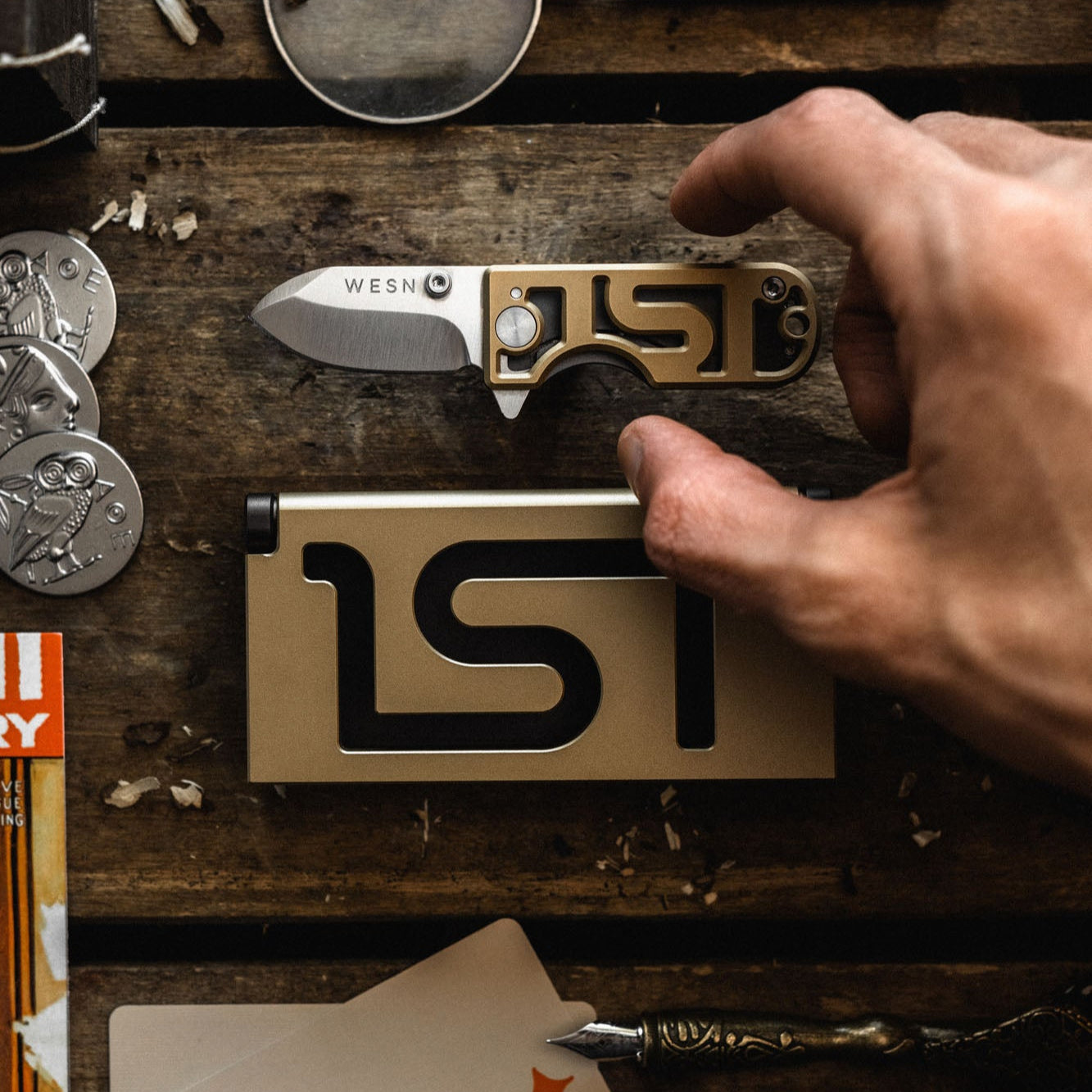 Upon solving the puzzle lies real surprise inside: a reimagined, version of WESN's bestselling Microblade. A skeletonized handle made of raw brass and titanium, this knife invites you to see its inner workings.